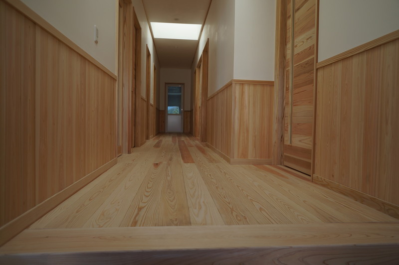 その他の部分には部屋により杉の無節、節ありを使い分け、また廊下などには檜の板貼りを採用しています。